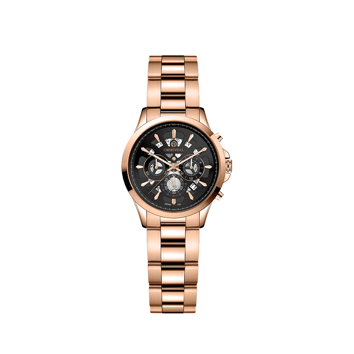 ساعت اورینتال زنانه کد O.SH176L-0008، ساعتی بسیار زیبا با رفرانس ۱۷۶، از نوع کرنوگراف بوده و جنس بند آن، فلزی می باشد. رنگ قاب این محصول، رزگلد، رنگ بند آن رزگلد و رنگ صفحه آن مشکی بوده و استایلی زیبا برای شما فراهم می کند.